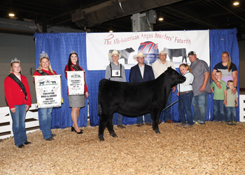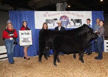 Adam McCauley, Cynthiana, Ky., won premier breeder at the 2025 All-American Breeders' Futurity Junior Show, June 14 in Louisville, Ky. Pictured from left are Annaliese Hardin, Miss Kentucky Angus; Rosalind Kidwell, Miss American Angus; Adam McCauley, recipient; Mark Davis, judge; and Paul Hill. Photo by Next Level Images.