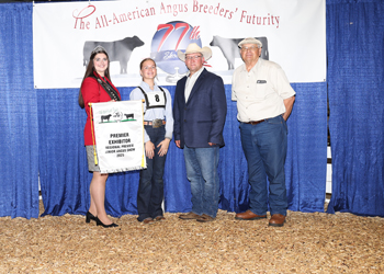 Emily Jeffries, Canmer, Ky., won premier exhibitor at the 2025 All-American Breeders' Futurity Junior Show, June 14 in Louisville, Ky. Pictured from left are Rosalind Kidwell, Miss American Angus; Emily Jeffries, recipient; Mark Davis, judge; and Paul Hill. Photo by Next Level Images.