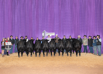 Express Angus Ranches, Yukon, Okla., won grand champion carload of bulls at the 2026 Cattlemen's Congress Angus Pen & Carload Show, Jan. 9 in Oklahoma City, Okla. The eight January 2025 bulls posted an average weight of 1,511 pounds and posted an average scrotal circumference of 41.13 centimeters. They are sired by RSA True Balance 1311, Crouch Congress and FF Rito Ambitious. Brian Barragree, Absarokee, Mont.; Jeremy Leister, Fairmont, Okla.; and Doug Schroeder, Clarence, Iowa, evaluated the two carloads and 15 pens. Photo by Next Level Images.
