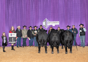 Express Angus Ranches, Yukon, Okla., won grand champion pen of three bulls at the 2026 Cattlemen's Congress Angus Pen & Carload Show, Jan. 9 in Oklahoma City, Okla. The Septermber 2024 bulls posted an average weight of 1,799 pounds and posted an average scrotal circumference of 40.7 centimeters. They are sired by FF Rito Ambitious and EXAR Cover The Bases 0819B. This pen first won yearling champion. Brian Barragree, Absarokee, Mont.; Jeremy Leister, Fairmont, Okla.; and Doug Schroeder, Clarence, Iowa, evaluated the two carloads and 15 pens. Photo by Next Level Images.