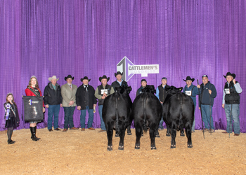 Oklahoma State University, Stillwater, Okla., won grand champion pen of three heifers at the 2026 Cattlemen's Congress Angus Pen & Carload Show, Jan. 9 in Oklahoma City, Okla. The February 2025 heifers posted an average weight of 942 pounds and are sired by FF Rito Ambitious and Connealy Commerce. This pen first won early calf champion. Brian Barragree, Absarokee, Mont.; Jeremy Leister, Fairmont, Okla.; and Doug Schroeder, Clarence, Iowa, evaluated the two carloads and 15 pens. Photo by Next Level Images.