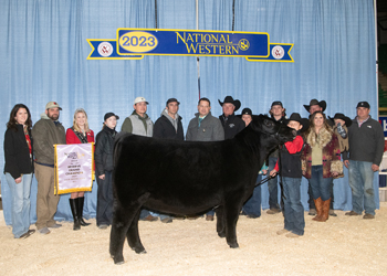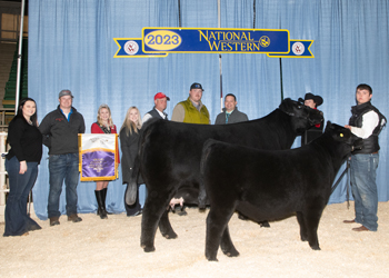 7/s Lucy 517 won grand champion cow-calf pair at the 2023 National Western Stock Show's Junior Angus Show, Jan. 12 in Denver, Colo. Xander Sundsbak, Des Lacs, N.D., owns the February 2017 daughter of PVF Insight 0129. A July 2022 bull calf sired by Boyd No Question 0006 completes the winning duo. Dan Harker, Hope, Ind., evaluated the 78 entries. Photo by Legacy Livestock Imaging.