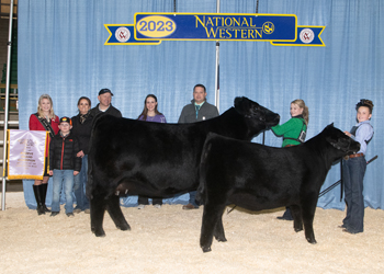 Blairswest Erica 5H won reserve grand champion cow-calf pair at the 2023 National Western Stock Show's Junior Angus Show, Jan. 12 in Denver, Colo. Tymber Billman, Blackfoot, Idaho, owns the January 2020 daughter of Colburn Primo 5153. An April 2022 daughter sired by Stevenson Turning Point is at side. Dan Harker, Hope, Ind., evaluated the 78 entries. Photo by Legacy Livestock Imaging.