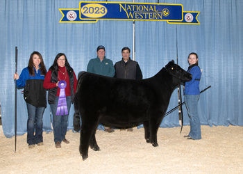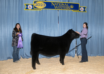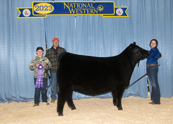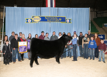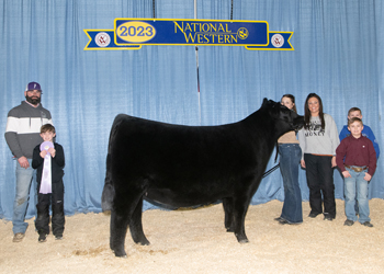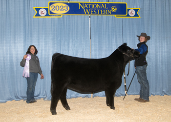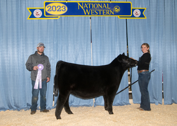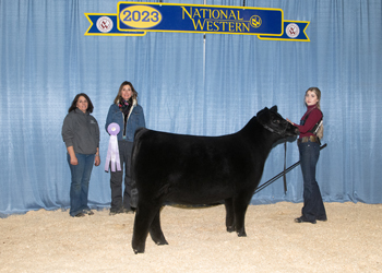 Lakeview Lady C 2119 won grand champion female at the 2023 National Western Stock Show's Junior Angus Show, Jan. 12 in Denver, Colo. Cheyenne Brunker, Ottawa, Kan., owns the April 2021 daughter of KR Casino 6243. She earlier won junior champion. Dan Harker, Hope, Ind., evaluated the 78 entries. Photo by Legacy Livestock Imaging.