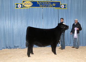SCC Heart N Sole 153 won intermediate champion heifer at the 2023 National Western Stock Show's Junior Angus Show, Jan. 12 in Denver, Colo. Delaney Jones, Harrod, Ohio, owns the winning heifer. Photo by Legacy Livestock Imaging.
