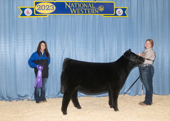 SCC SLL Phyllis 262 won summer heifer calf champion at the 2023 National Western Stock Show's Junior Angus Show, Jan. 12 in Denver, Colo. Olivia Jones, Harrod, Ohio, owns the winning heifer. Photo by Legacy Livestock Imaging.