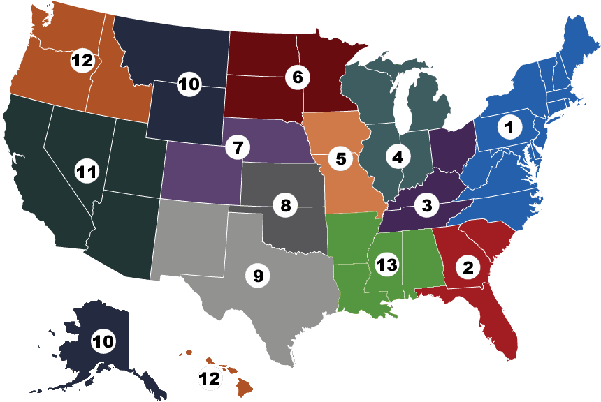 Region 1: CT, DC, DE, MA, MD, ME, NC, NH, NJ, NY, PA, RI, VA, VT, WV