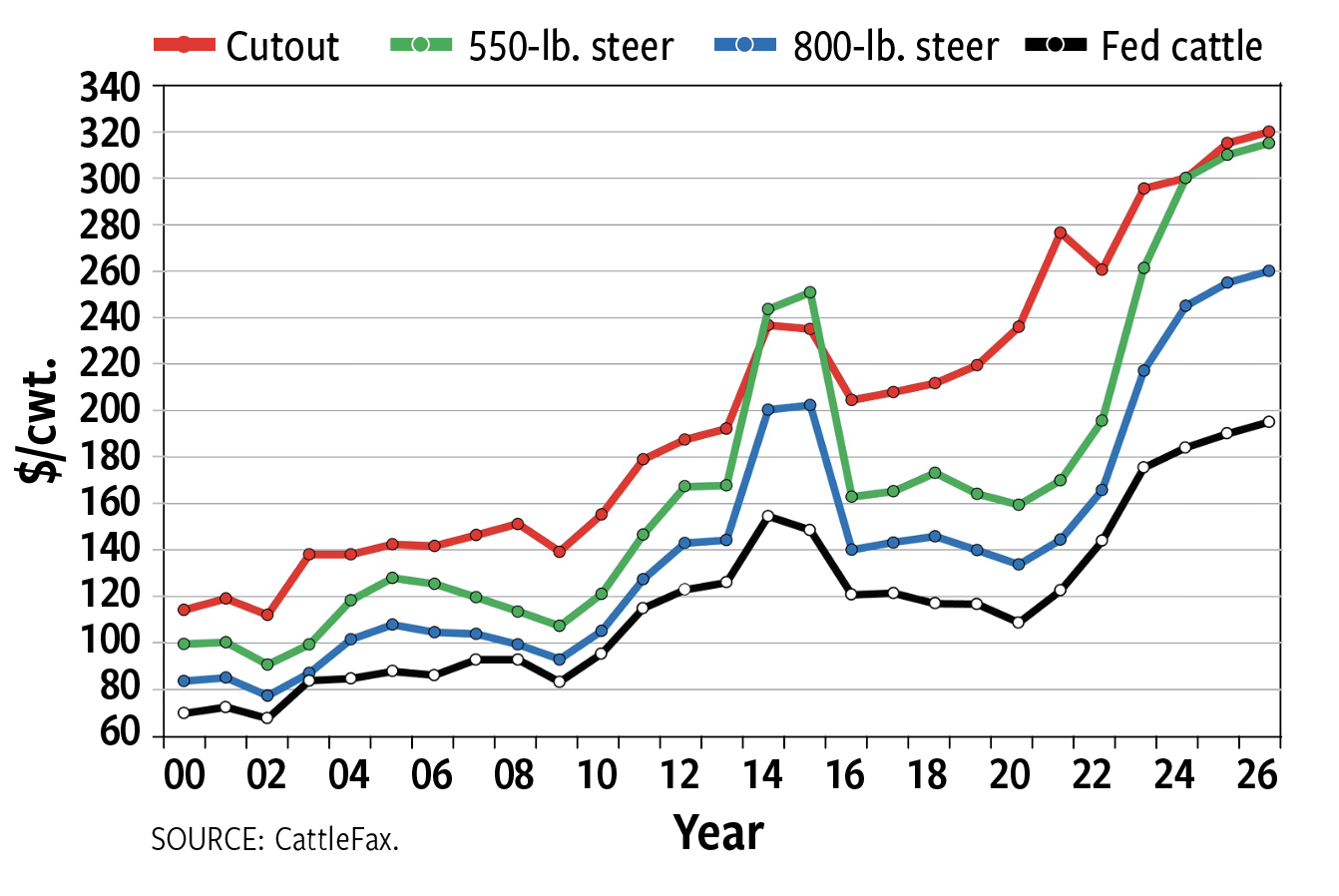 Volatility combined with the higher equity at stake in a higher market increases the importance of risk management strategies. This can include futures, options, livestock risk protection insurance (LRP), or forward contracts. Having flexibility and exploring different marketing avenues and marketing windows, whether via video sales, direct sales or auction markets, is also just good business. What works best varies by operation, but a little attention to risk management and marketing can go a long way toward maximizing the good times in the cattle cycle.