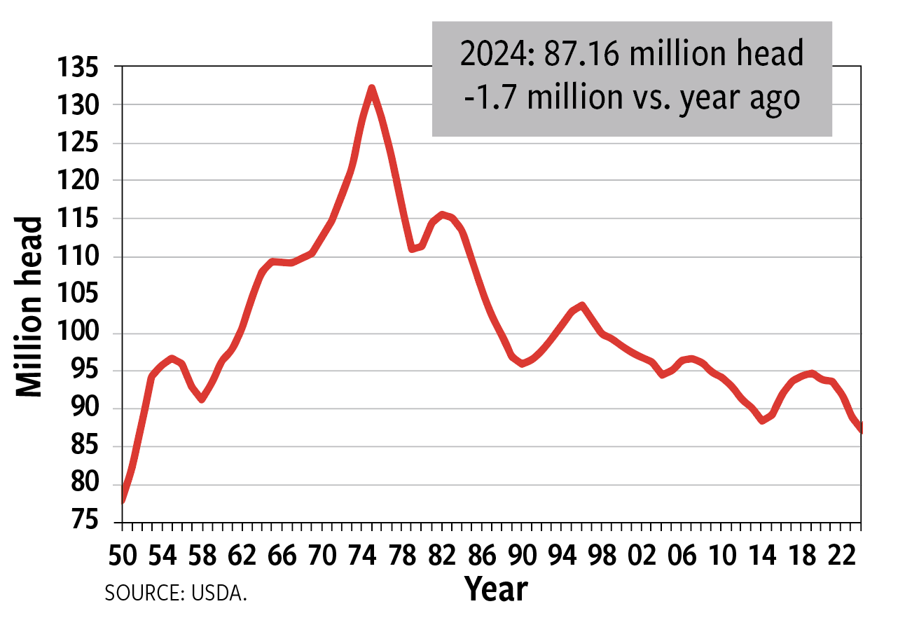 CattleFax anticipates several years of tighter supplies remain ahead. U.S. beef cow inventories dropped 716,000 head to begin 2024, the smallest inventory since 1961. Another smaller decline is expected to begin 2025, as USDA reports the smallest number of bred heifers in decades will be entering the mature cow herd this year.