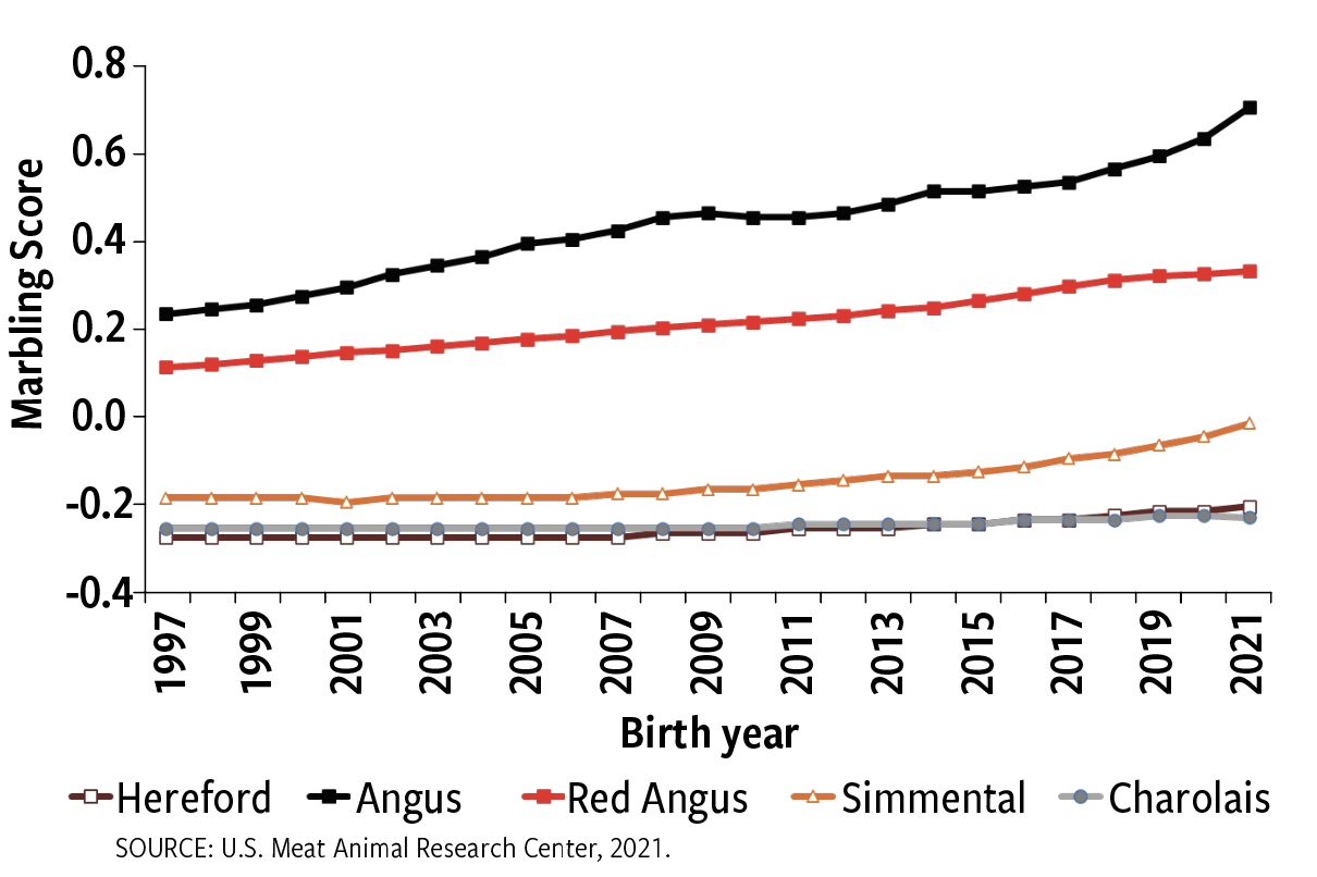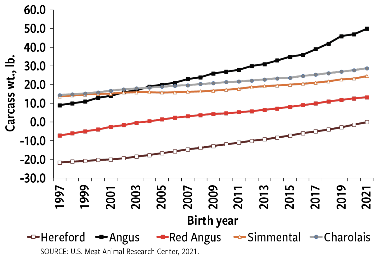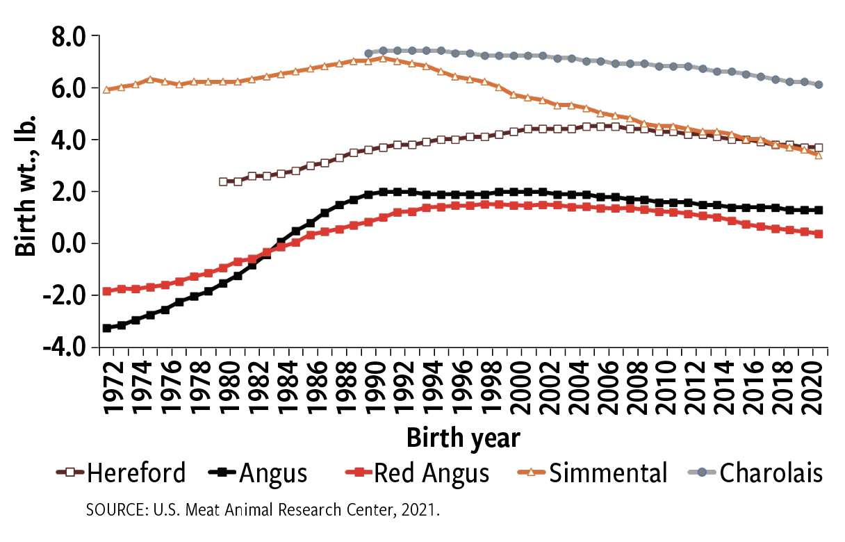 Figures from USMARC, adapted from the Spring 2021 Genetics Trends from Breed Associations and 2021 Across-breed Expected Progeny Difference (AB-EPD) Adjustment Factors show that animals continue to maintain favorable calf size (see Fig. 1) as an indicator of desired calving ease and a clear continued dominance in marbling score (see Fig. 2) and carcass size (see Fig. 3).