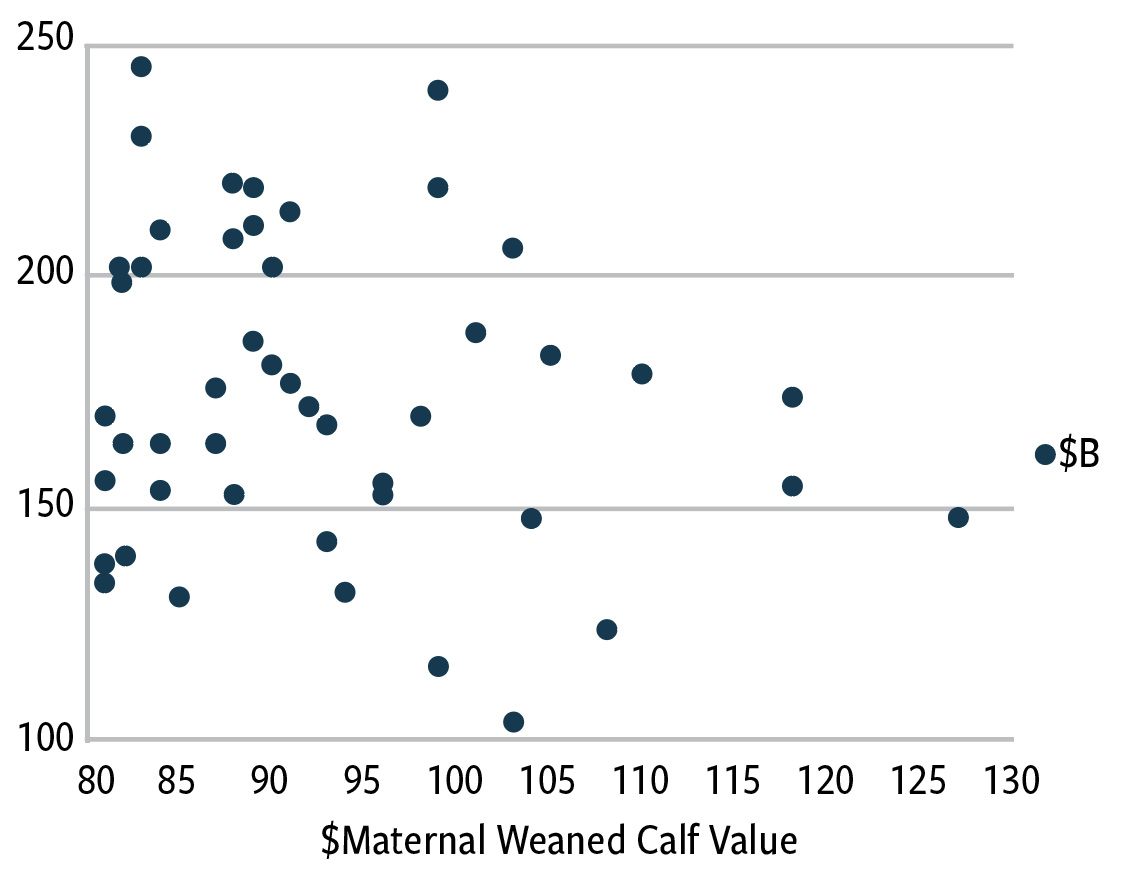 Fig. 2: Top 200 bulls ranking in top 10% of current sires for maternal weaned calf value ($M) by beef value ($B)