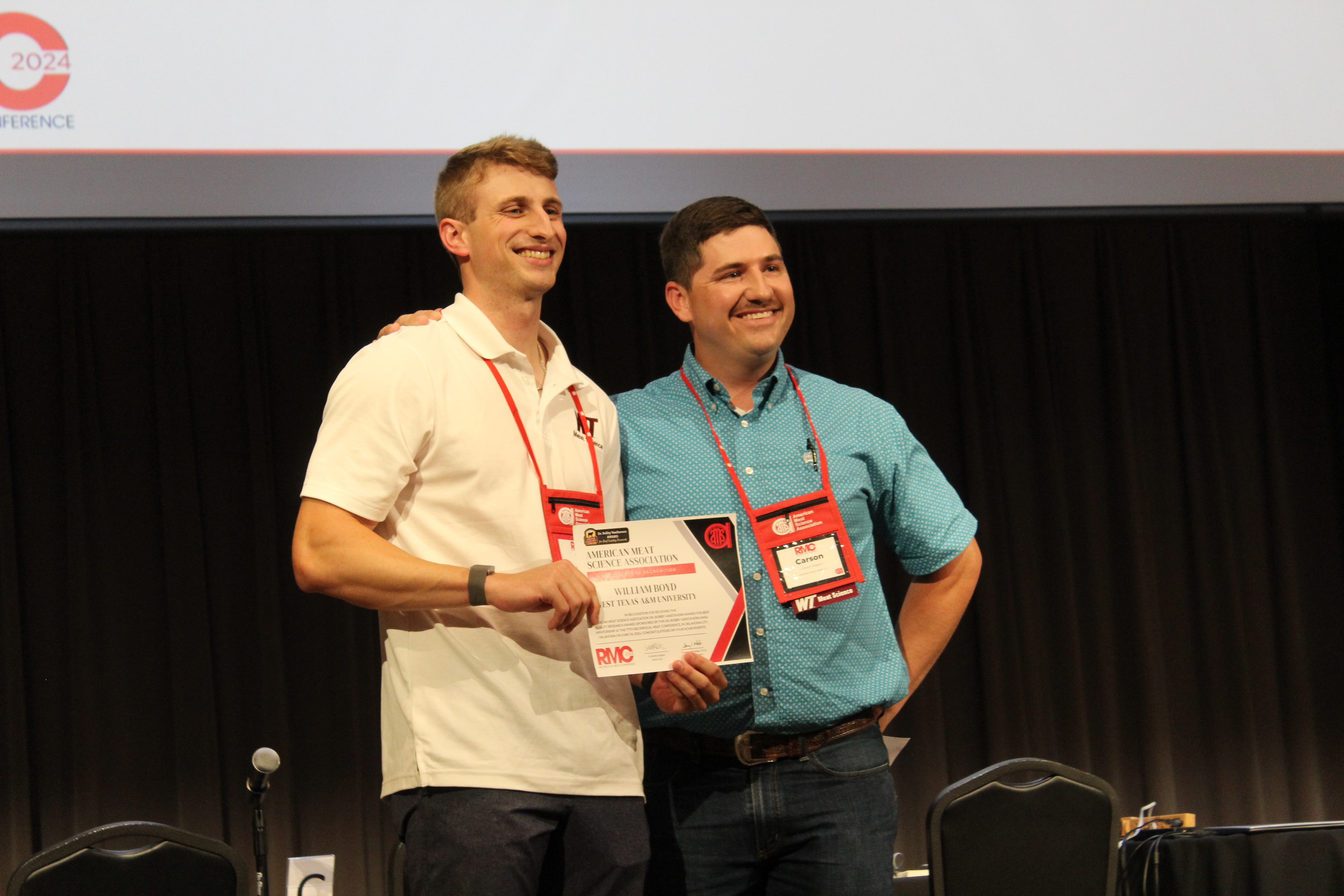 West Texas A&M student William Boyd, left, receives the Dr. Bobby VanStavern Award for his research on post-ribbing quality.