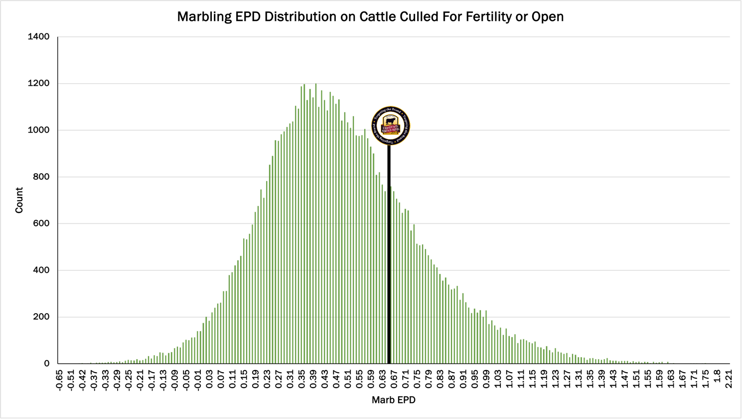 From 2010 to 2023, more than 72,000 females were culled from the herd due to being open or having other fertility issues. Many culls fall below the black line representing the Targeting the Brand minimum requirement for Marb EPD (+0.65).