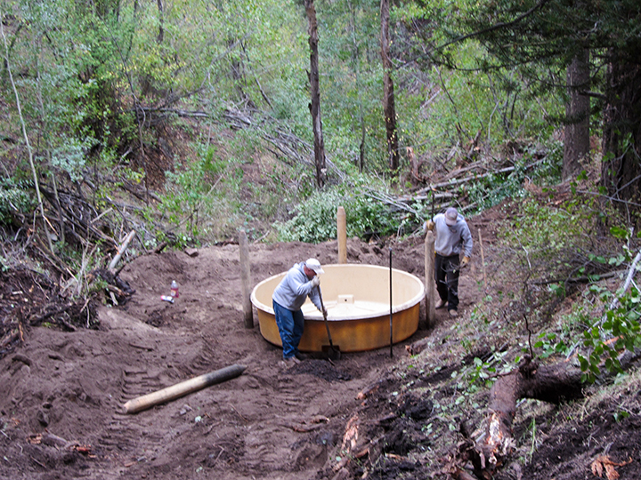 Author Heather Smith Thomas and her family installed a fenceline waterer, capturing water from a spring to serve two mountain pastures during fall/winter grazing. Even if the rest of the surface freezes, where the inflow pipe dumps water in, the surface stays open.