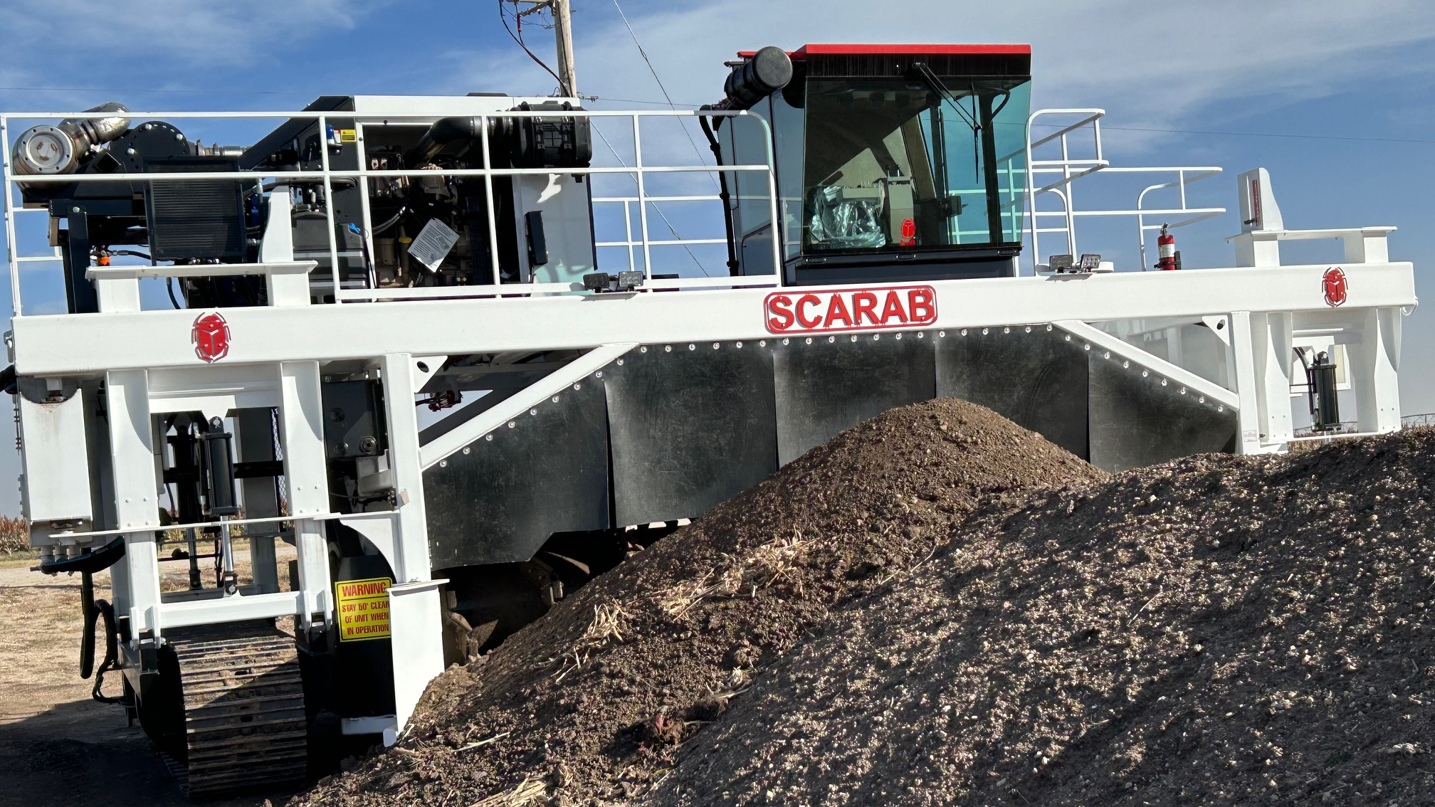 Plastic grocery bags woven together like macramé. Wads of net wrap so tightly bound that the fibers seemed ground together. Loops of baling twine. What appeared to be balloons and other forms of loose plastic. All being unearthed when the massive Scarab compost turner made its way down the rows of 4- to 5-year-old compost.
