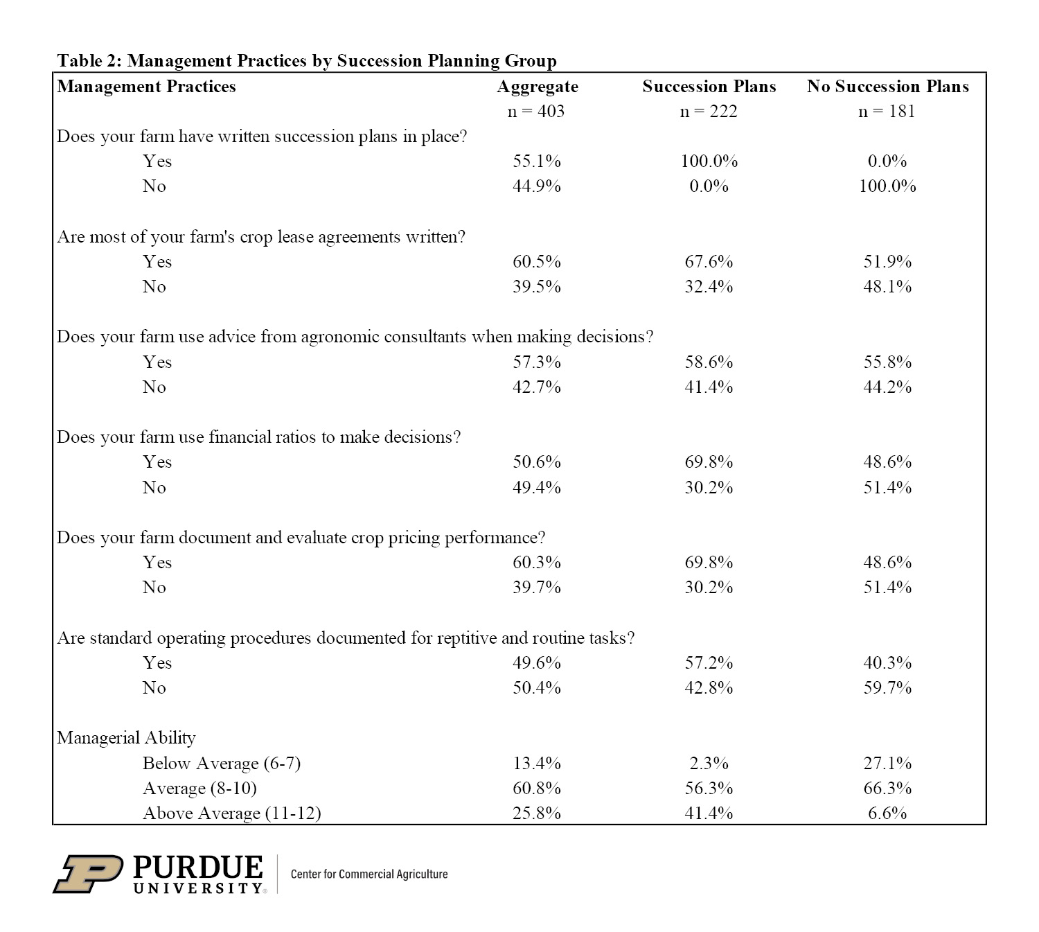 The strongest correlations occurred between succession planning and various management practices. These include positive statistically significant correlations with the use of written lease agreements, the use of financial ratios when making decisions, the use of crop pricing alternatives and the use of standard operating procedures for routine tasks. We created a metric for managerial ability using the six management practice questions. Succession planning was positively and significantly correlated with managerial ability. Results indicate that farms with succession plans in place generally implement other good management practices more than farming operations without succession plans. Moreover, farms with succession plans on average possess superior managerial abilities relative to farms that do not have succession plans in place. Our metric for managerial ability shows that 98% of farm managers with succession plans in place have at least “average” managerial abilities. In contrast, farms without succession plans in place have lower managerial abilities, with 27% of this group having a “below average” managerial ability score and only 7% with an “above average” managerial ability score.