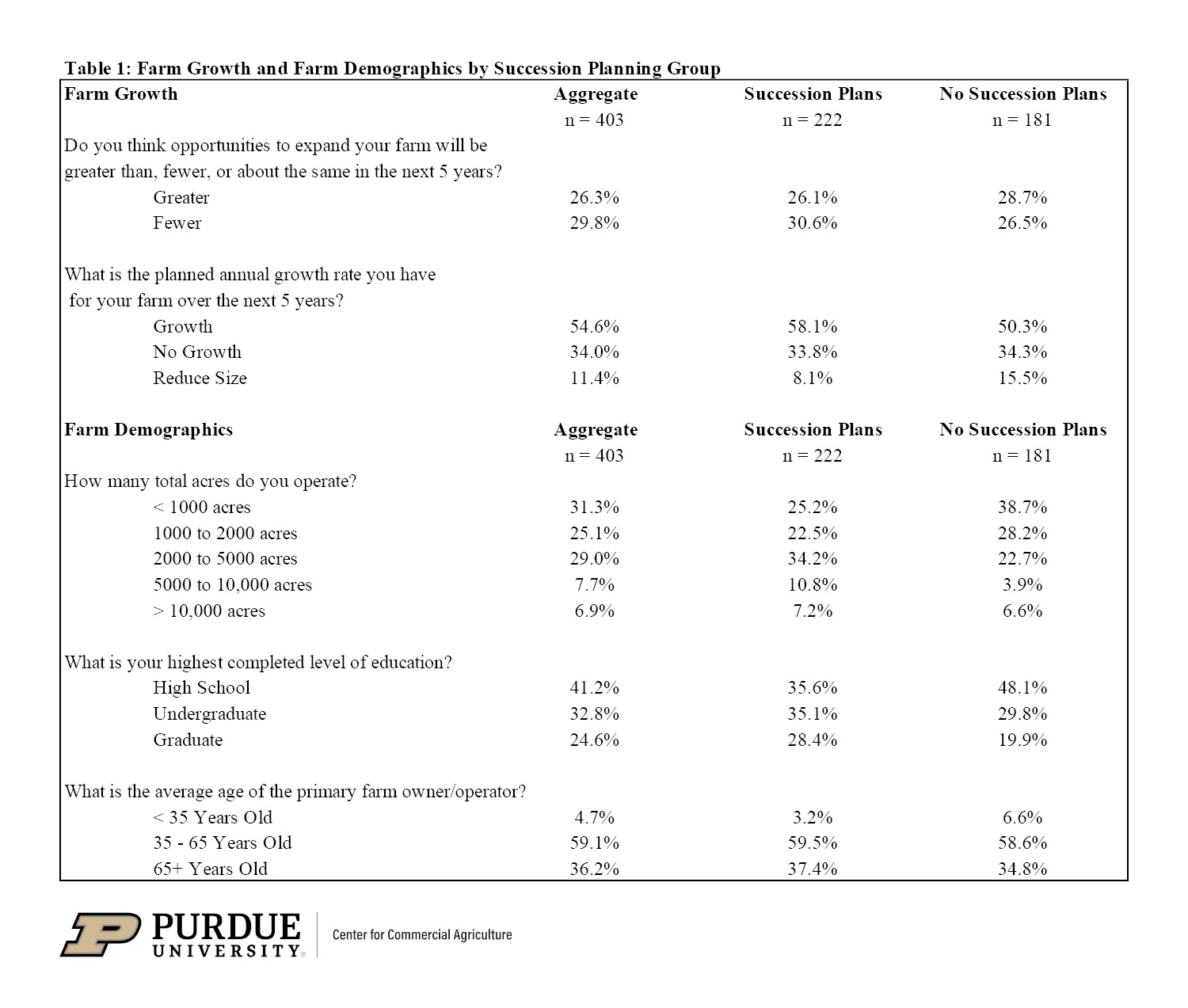 Table 1: Farm growth and farm demographics by succession-planning group