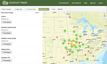 Sellers of co-products like soyhulls, distillers’ grains or corn gluten feed, as well as forages like corn silage or hay, can share prices, product information and locations with potential buyers at no cost, he says. Buyers can view available products on an easy-to-navigate map, complete with product details and a delivery cost estimator. Feedstuff listings are free and can be sorted by forage or co-product type and price per unit.