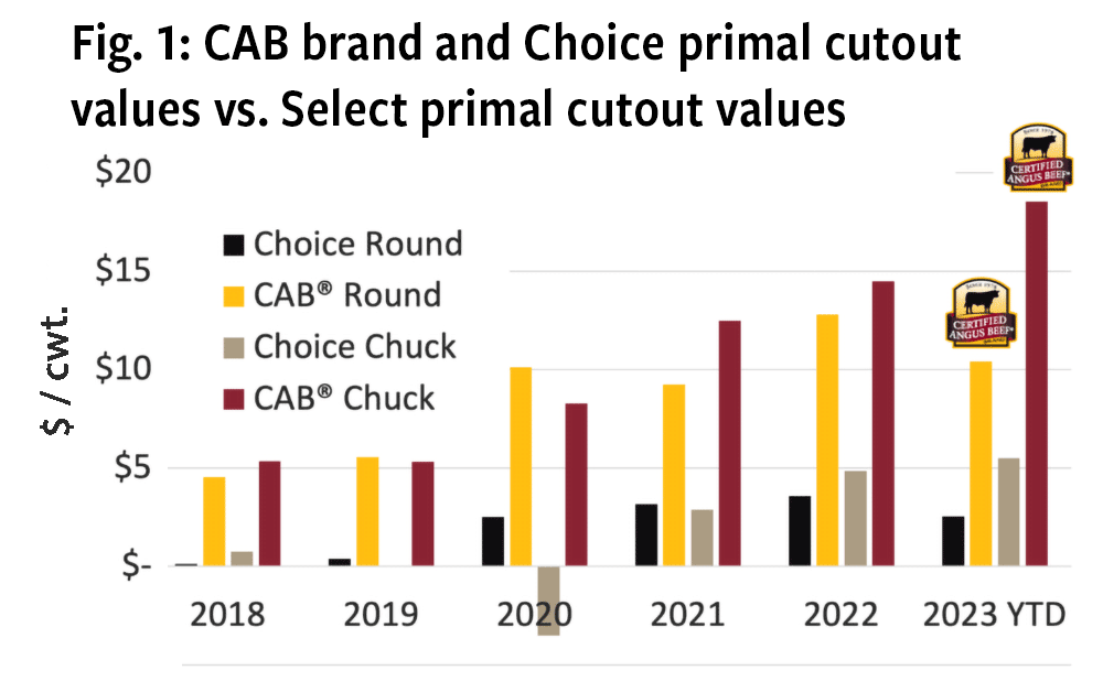 One of the unique attributes about the CAB brand is the fact that value creation through premium attributes and branding is not isolated to the middle-meat steaks and roasts. Indeed, both the CAB rib and loin primals carry a larger price premium than the chuck and round. However, the higher trending premiums derived from the less famous end meats are to be credited with a good portion of the increasing total carcass cutout premium that CAB-brand carcasses command today.