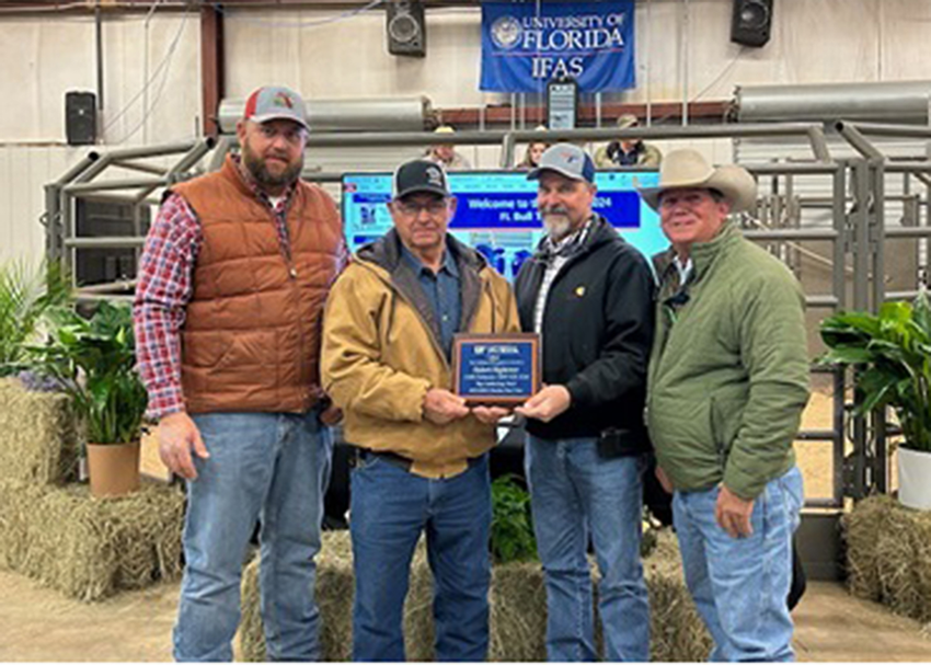 Hubert Hightower, Waukeenah, Fla., consigned the 2023 high-indexing Angus bull and overall high-indexing bull to the University of Florida’s 24th Annual Bull Test Sale, Jan. 20, 2024, in Greenwood, Fla. LHH Enhance 5209 G26 K14 is a September 2022 son of SydGen Enhance. He posted an average daily gain of 5.18 pounds (lb.), with an adjusted yearling weight of 1,463 lb. Pictured are (from left) David Thomas, North Florida Research and Education Center (NFREC) Beef Unit manager and Bull Test foreman; Hubert Hightower, consignor; Dean Pringle, NFREC director; and Pat Durden, Florida Cattlemen’s Association president.