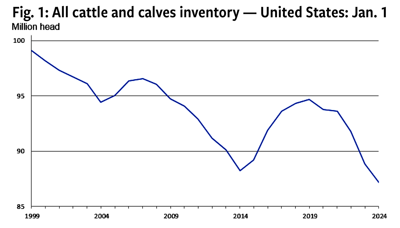 Beef cow numbers are down 2%, while cattle-on-feed numbers are up from 2023.