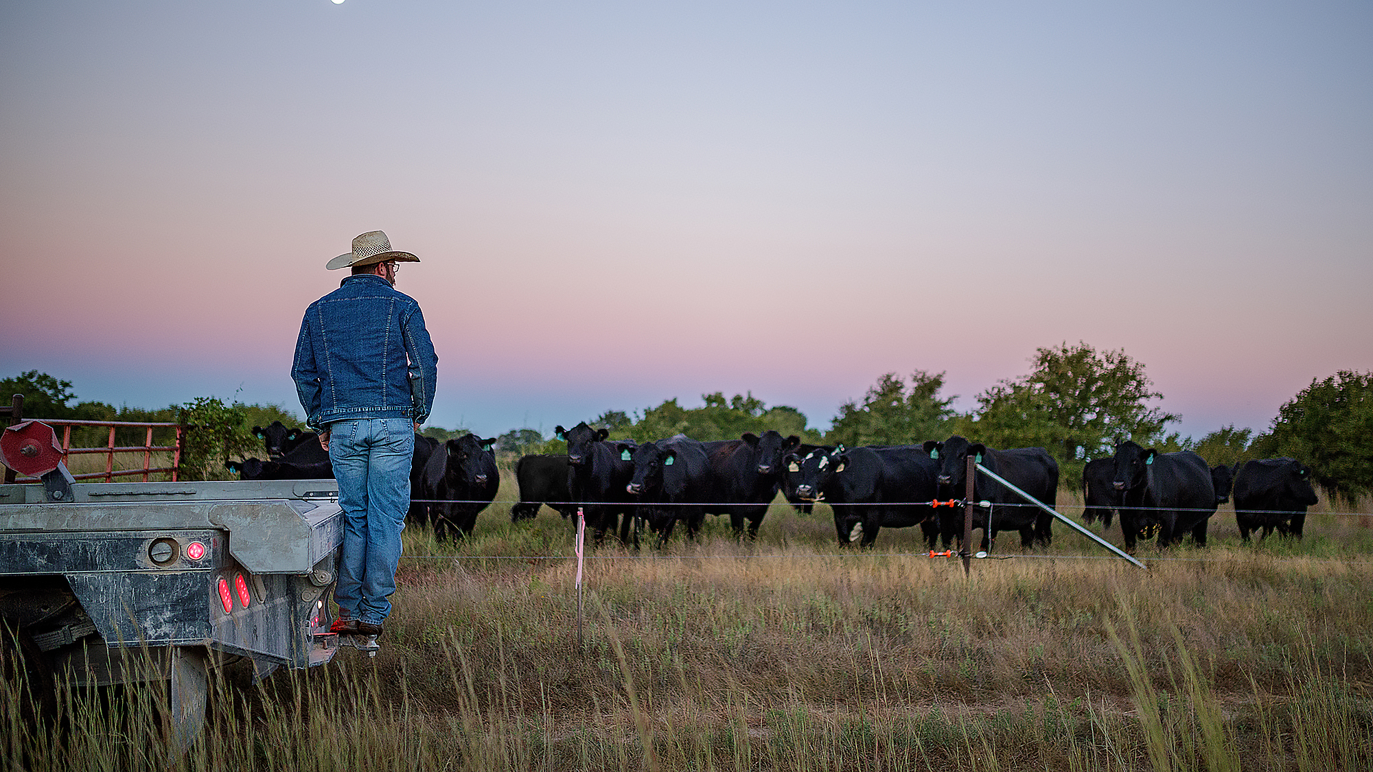 As the sun rises, Noble Research Institute ranch team member Jeremy Westfall observes a herd of Angus cattle ahead of a move on Oswalt Ranch in Marietta, Okla. [Photo by Rob Mattson/Noble Research Institute]