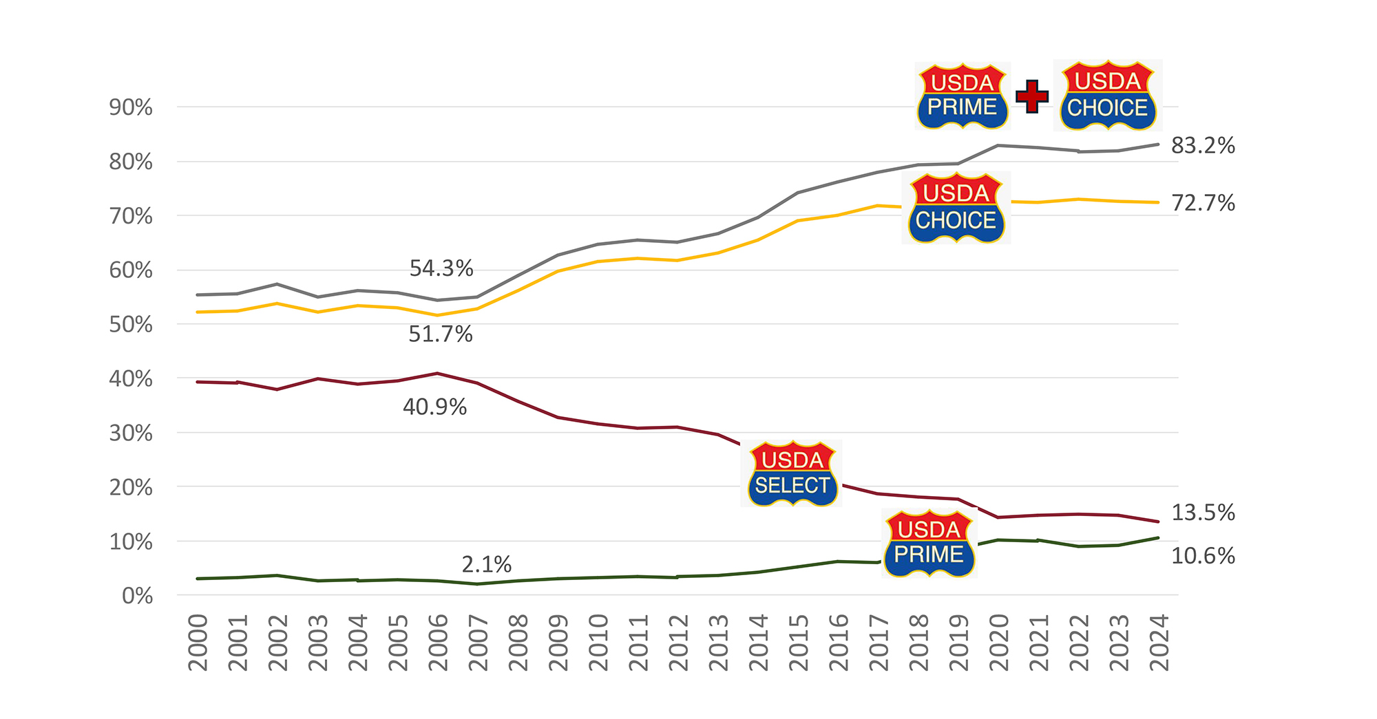 Since 2006, which was the low in modern U.S. quality grade, the industry has seen increases in Choice, Prime and premium Choice, like CAB. At the same time there has been a simultaneous decline in USDA Select grade, Dykstra said. “Which I think is key, and we need not forget about that important feature of this quality grade improvement.”