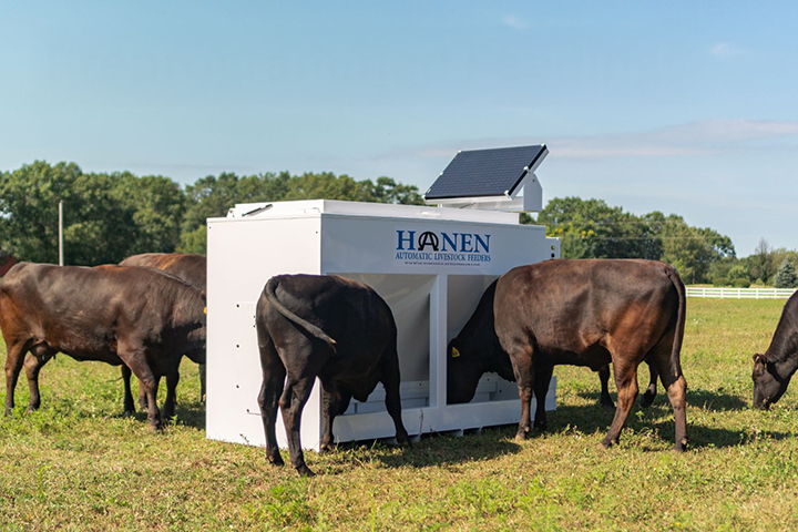 The Expandable Hanen Automatic Solar-Powered Livestock Feeder provides programmable timed nutrition of various free-flowing feed types to livestock, up to 12 daily feedings. Hanen’s patented Hydraulically Powered Feed Dispensing System uses fewer moving parts for less maintenance.