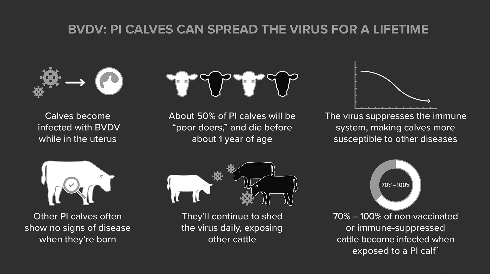 PI calves are animals that become infected with BVDV during their time in utero. When the calf is infected before their immune system is able to recognize the virus as foreign, they can become a PI calf. This enables the virus to live and grow within that calf indefinitely.