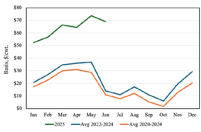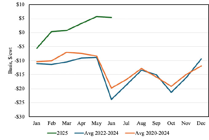 For both classes of cattle, there is a sharp divergence between 2025 basis and the three- and five-year historical averages. This divergence is especially pronounced for calves, where basis is much stronger (more positive) than historical norms. Relying on historical basis to forecast 2025 prices would result in a major error — large enough that it would be obvious in hindsight.