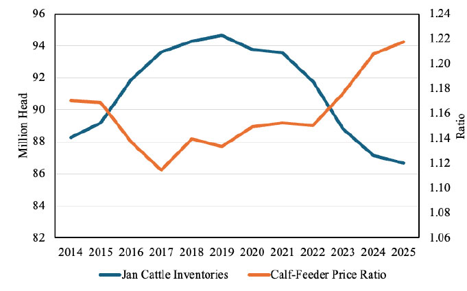 Fig. 1: Calf-to-feeder-cattle price ratio and Jan. 1 cattle inventories