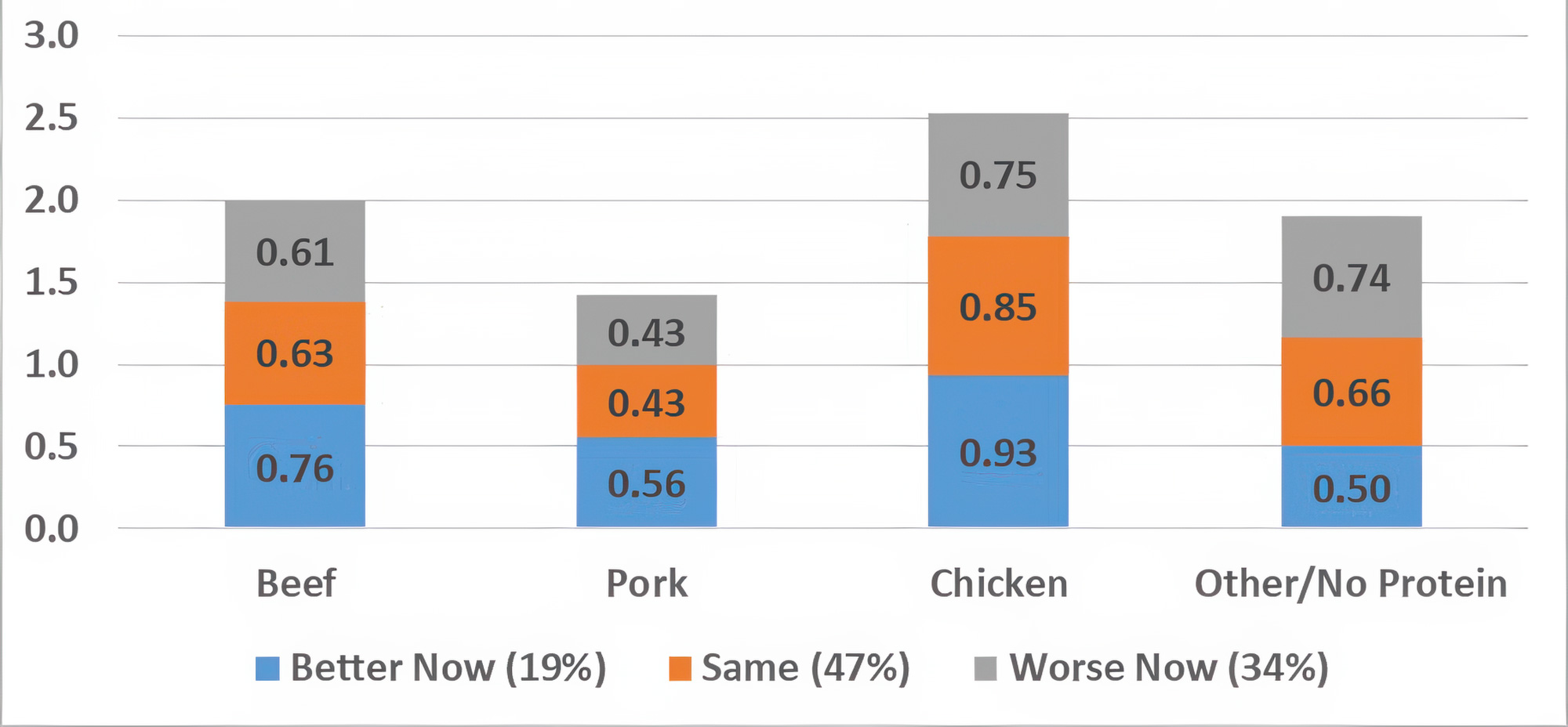 Fig. 1: Prior-day meal, protein inclusion rate by financial sentiment (now vs. one year ago) for July 2025