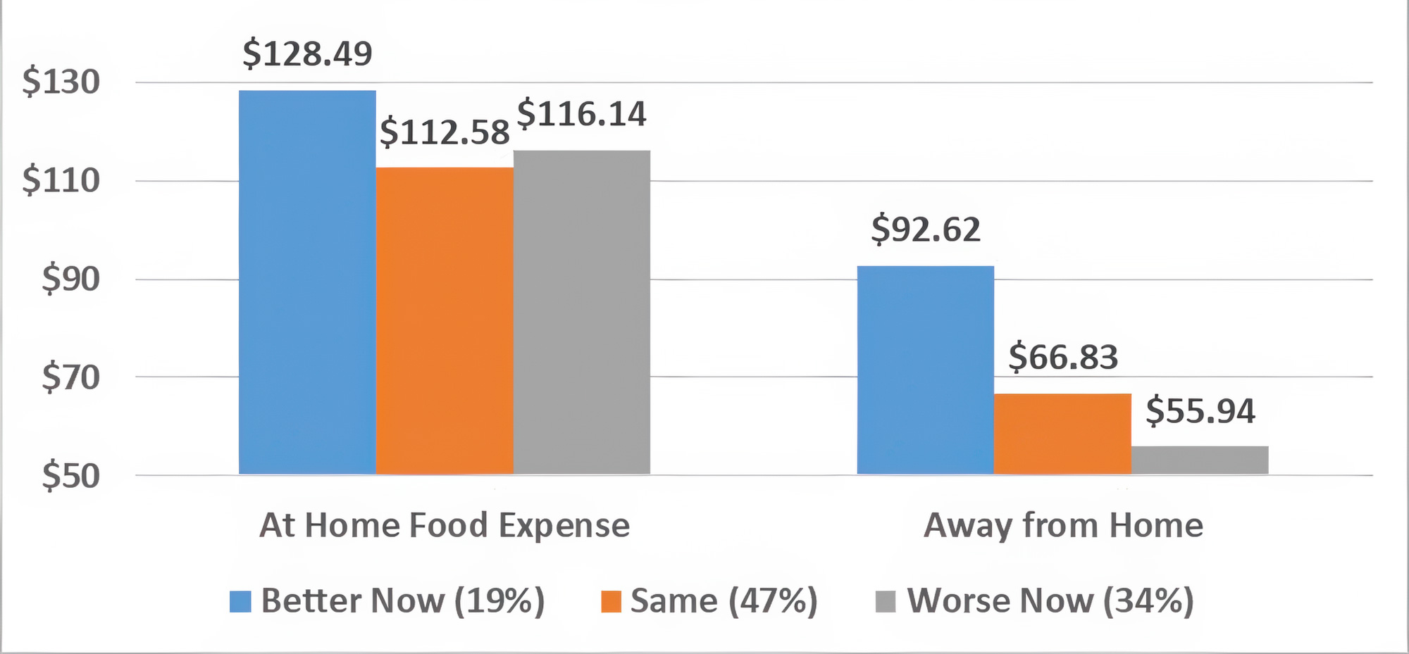 Fig. 2: Avg. weekly food expenses by financial sentiment (now vs. one year ago) for July 2025