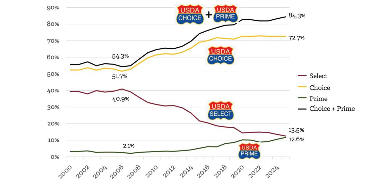 USDA Prime accounts for 12.6% of carcasses today, with combined USDA Choice and Prime reaching 84%. While higher-quality cattle flood the market, the Select supply continues to drop.