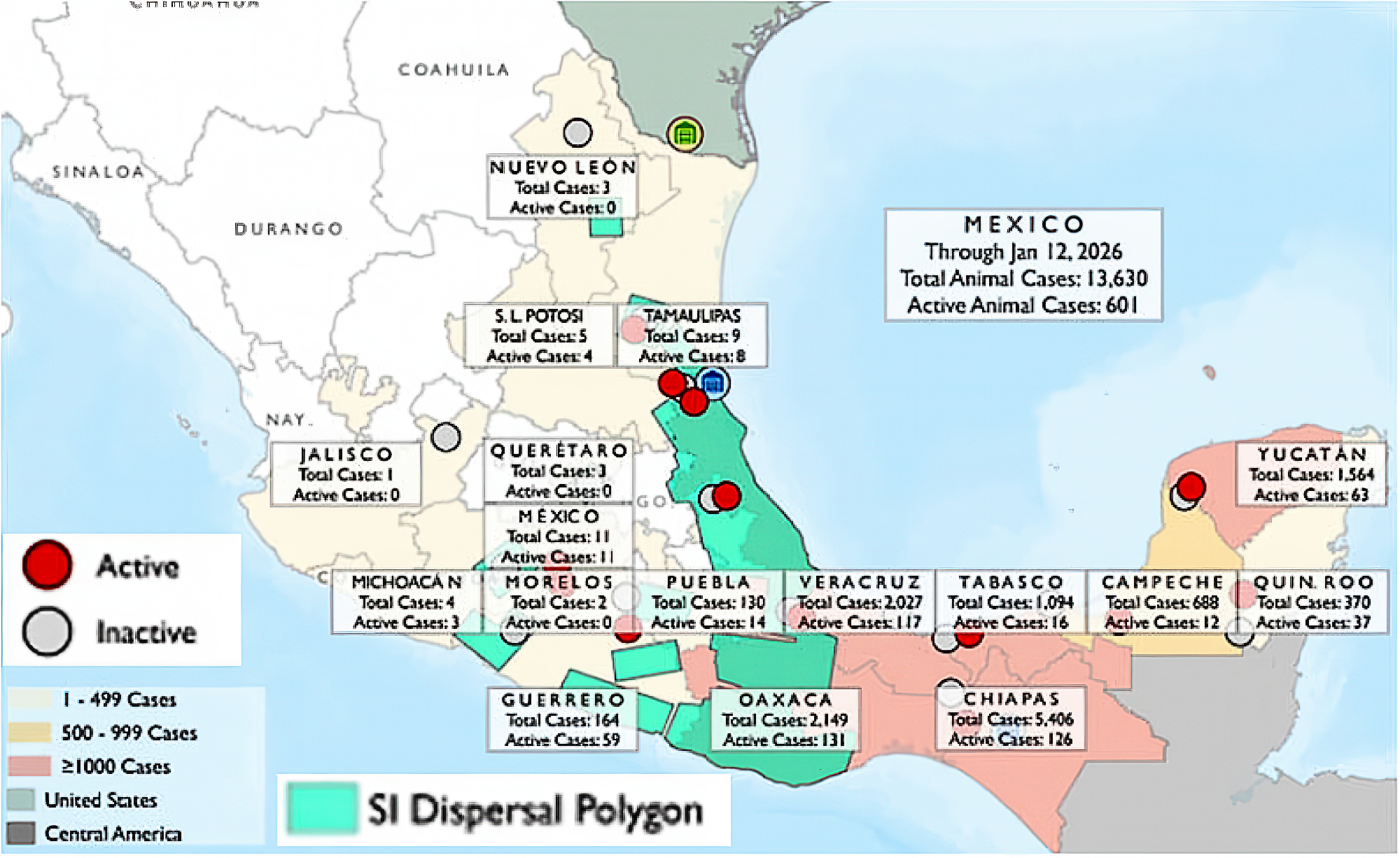 The rumor was that NWS had been found in the United States. As far as we know, this was not true. What is true is that Mexico is now finding more cases of NWS within the 400-mile buffer zone that was supposed to remain clear of the infestation. If earlier cases were tied to cattle imported from the south, more recent cases appear to be truly local. There are now 11 active cases of NWS in the state of Tamaulipas (see map), with eight of those reported last week alone.