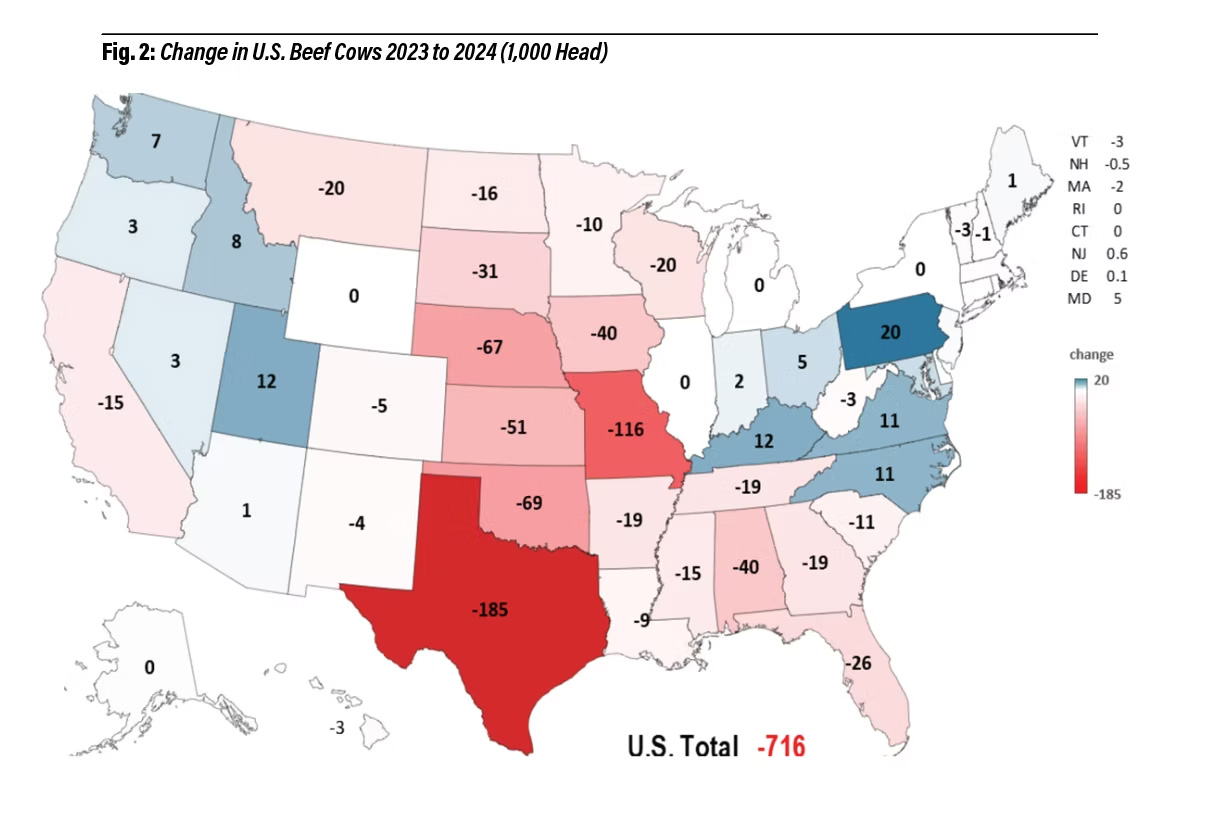 Beef cow liquidation was most severe in the Southern Plains with Texas losing 185,000 cows. Missouri continued with a 116,000-head drop, Oklahoma down 69,000, and Kansas dropping 51,000 head.