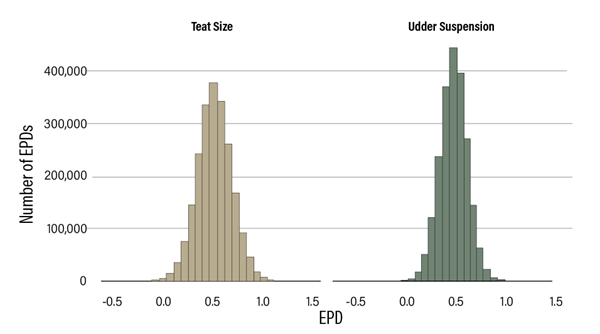 While overall smaller teats and tighter udders tend to result in less problems, breeders need to consider making breeding decisions to avoid extremes on either end of the scale. In this context, while higher EPDs would lead to smaller teats and tighter udders over generations, caution is needed not to push the herd towards an undesirable extreme.