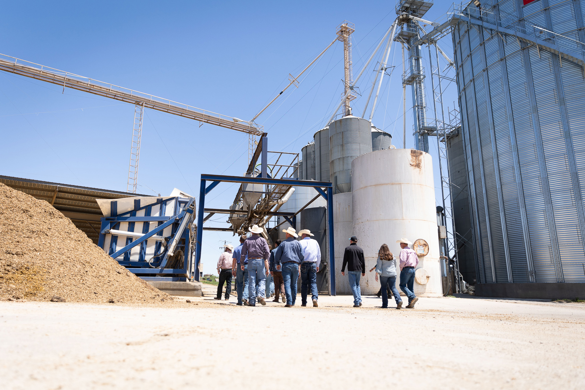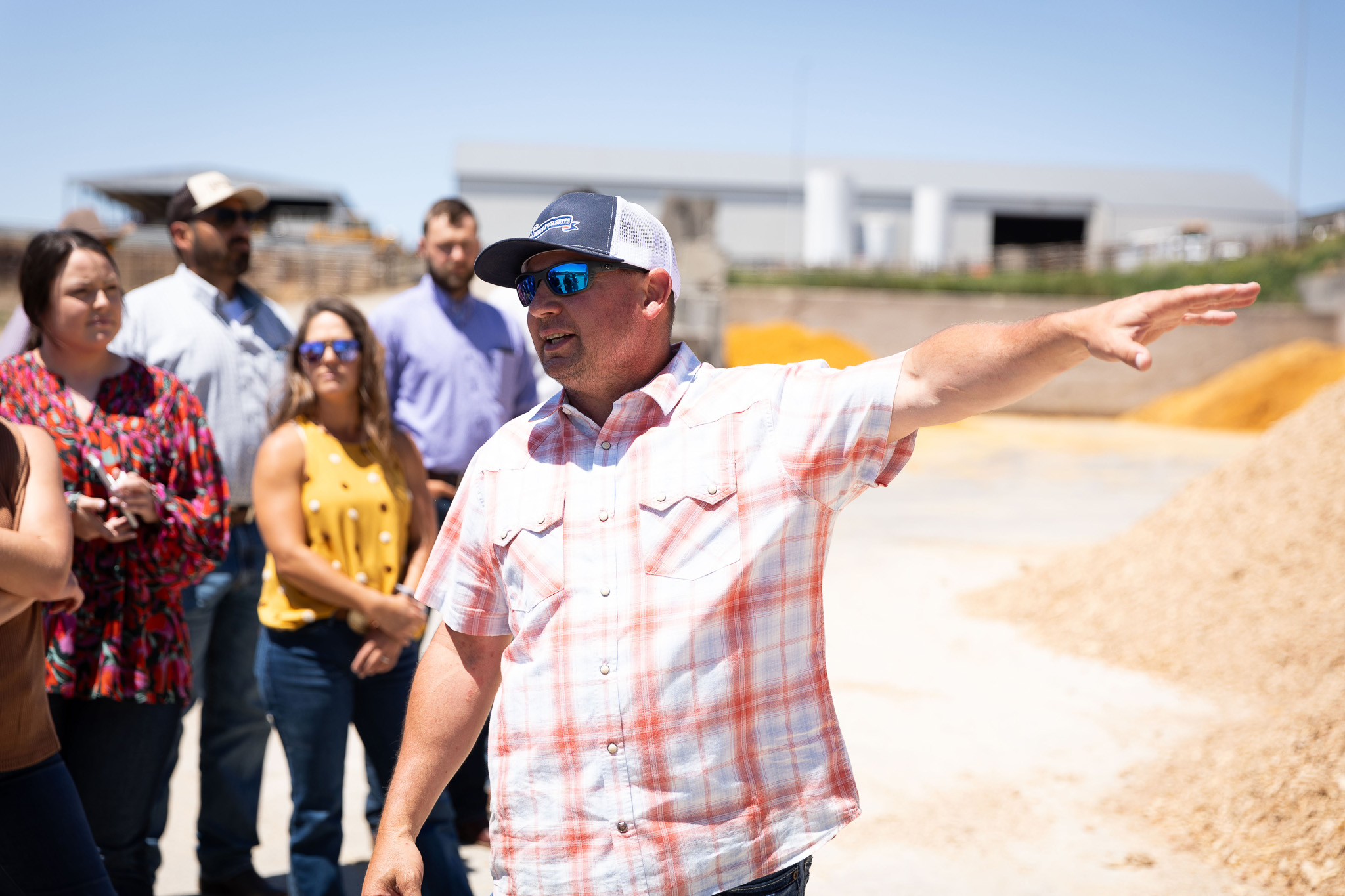 The BLI group surveys the Weborg Feedyards facility, and Tyler Weborg explains how they manage the different groups of cattle.