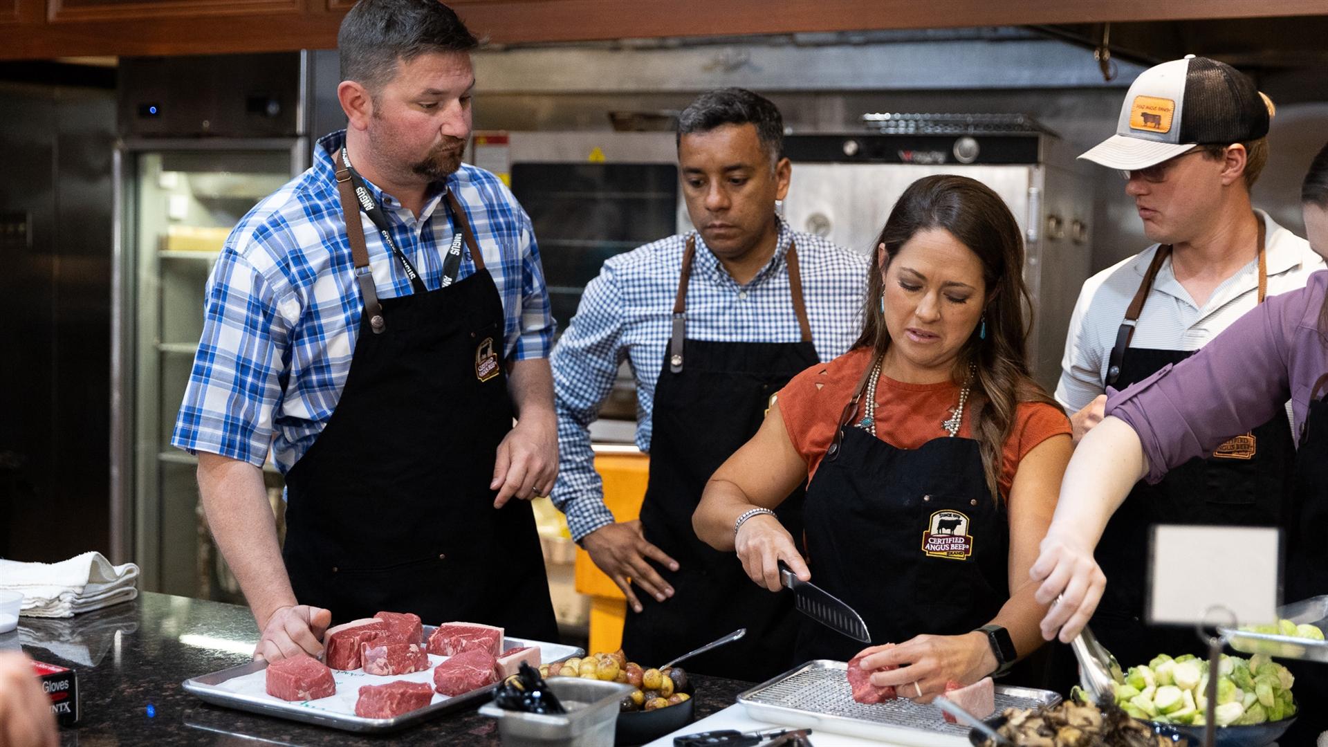 Attendees toured the CAB headquarters, met with staff, and spent time in the Meat Lab learning about the brand’s 10 standards for qualification and the distribution of carcass value. The group rounded out the week in the Culinary Center where they cooked up a steak lunch with CAB chefs.