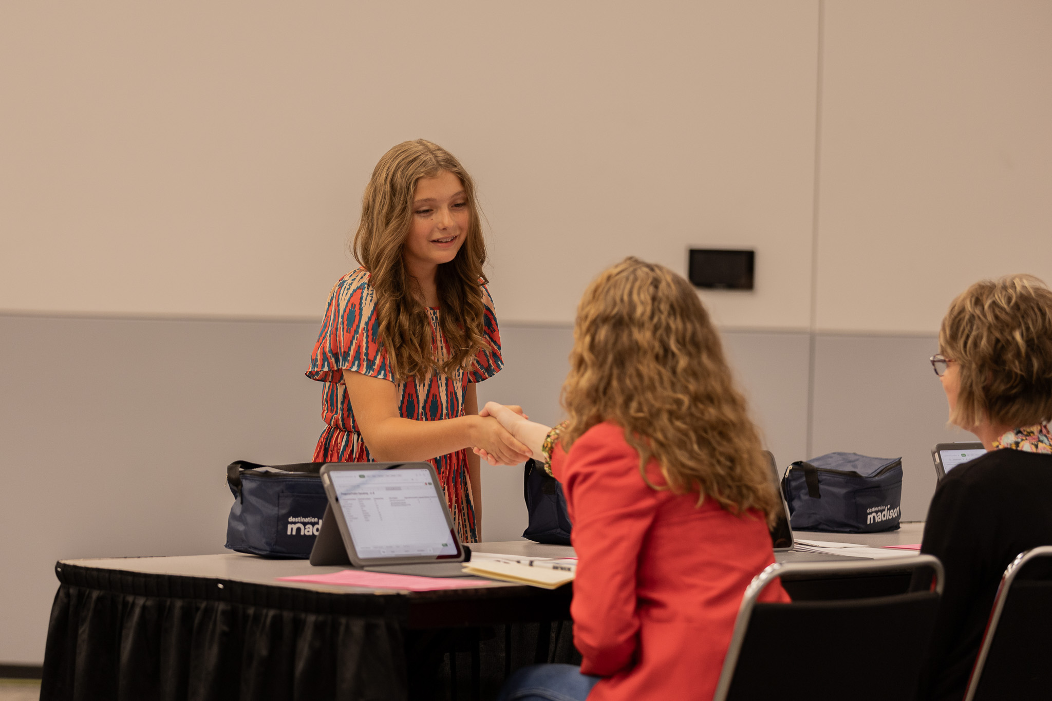 Claire Marie Atterholt shakes the judge’s hands and introduces herself before delivering her prepared public speech. She took a third-place finish in the junior B division of the 2024 contest.