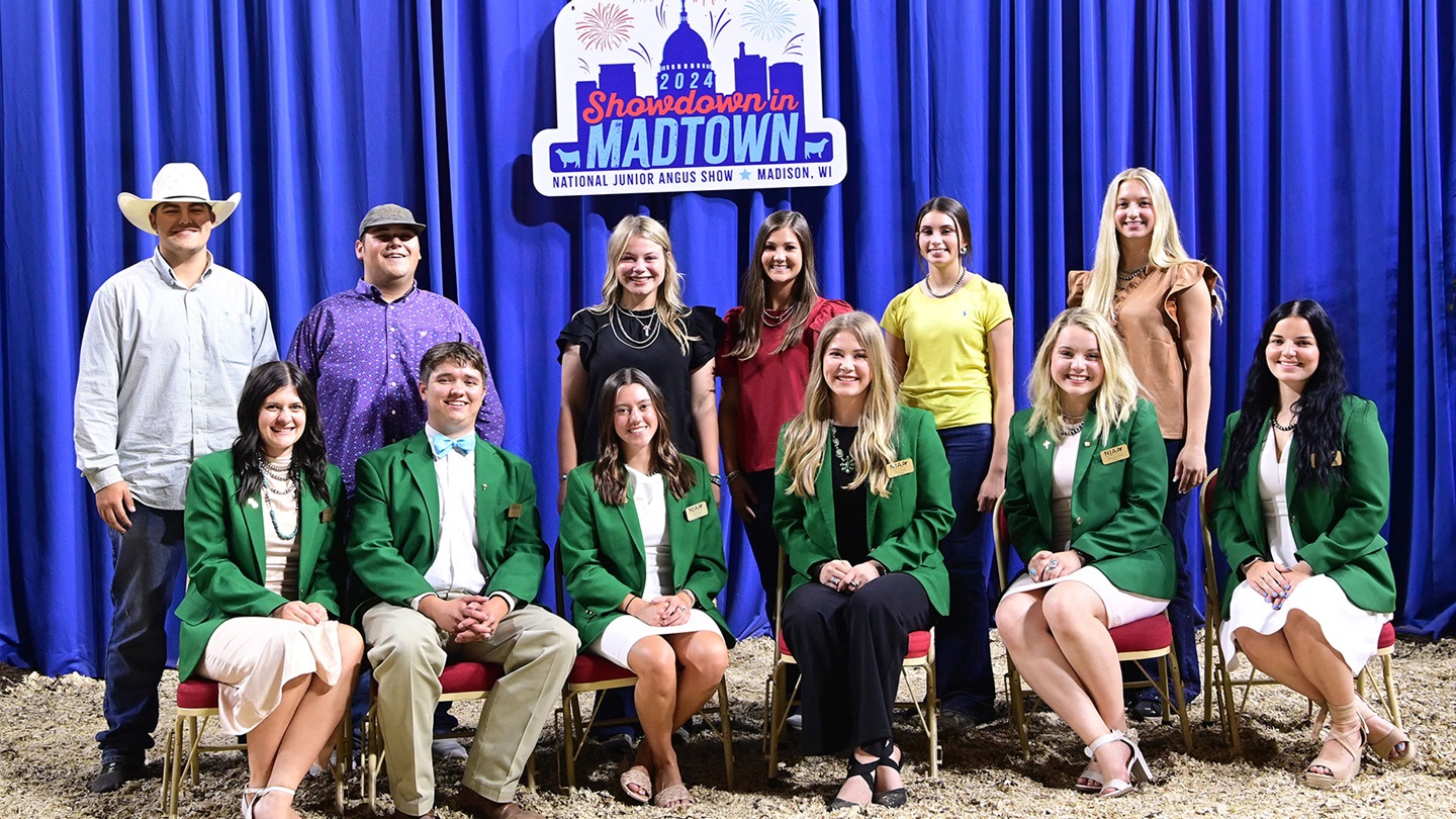 Newly elected directors for the National Junior Angus Board pose alongside second-term directors during the awards ceremony at the 2024 National Junior Angus Show on July 5 in Madison, Wis.