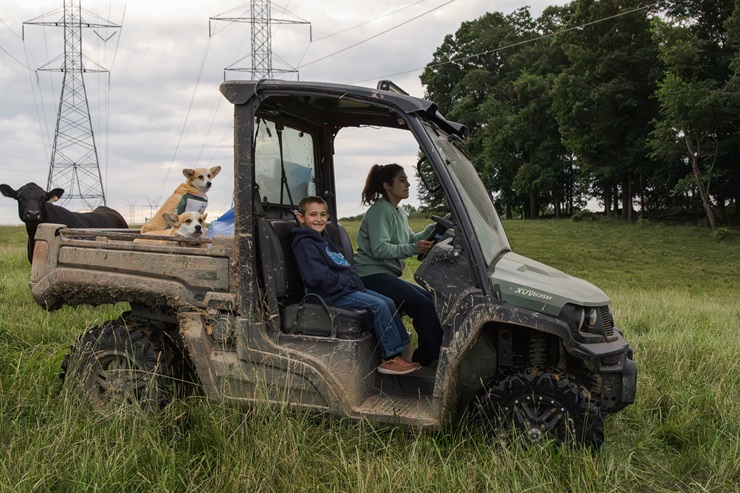 Kelsey, her son and their two corgis along for an early-morning ride to feed the cattle.
