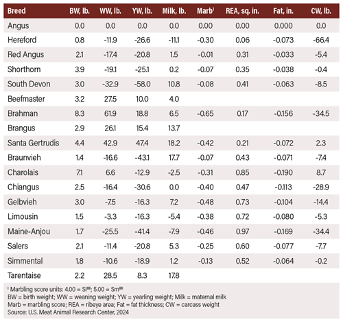 Table. 1: 2024 adjustment factors to add to EPD values of respective breeds to estimate across-breed EPDs.