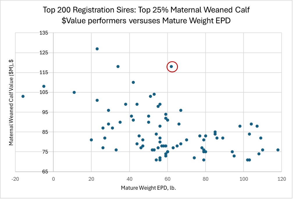 Top 200 registration sires: Top 25% Maternal Weaned Calf $Value performers vs. Mature Weight EPD