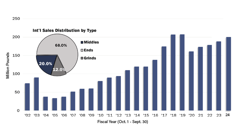 “Some countries, like Vietnam, are big middle meat customers for us,” Jones says. “Others buy primarily grinds. In general, we are pushing for more sales of round items.”
