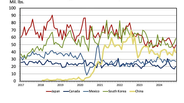 USDA’s January 2025 forecast is for beef exports to decline to 2.6 billion lb. in 2025 compared to 3 billion the last two years, due to 2025 beef production decreasing to 25.8 billion lb. from 27 billion. But history has shown the U.S. beef industry is very resilient and adaptive at producing more beef than expected, remembering just back to last year.