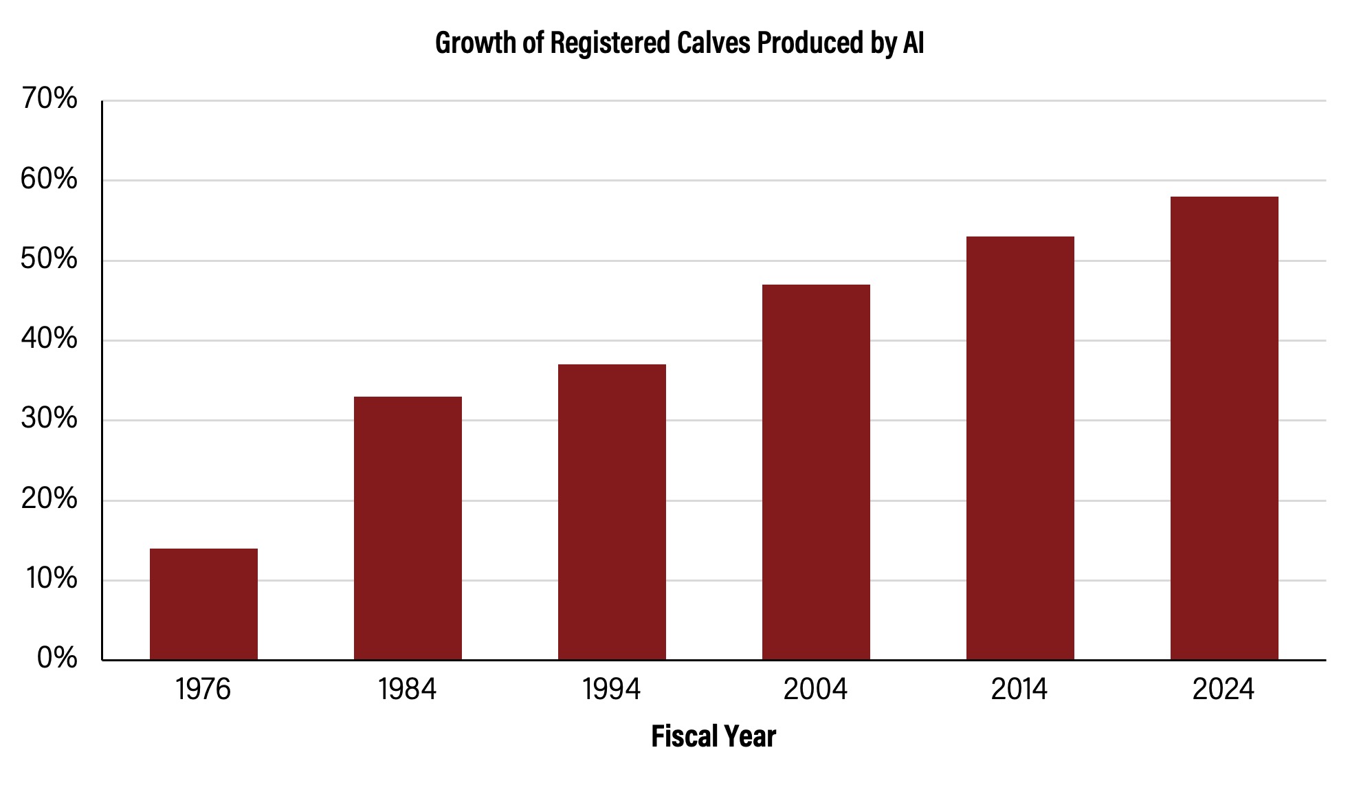 Looking back over time, in 1976, four years after open AI was made available, 14% of registered calves were produced by AI (Figure 1). From 1976 to 1984, there was a 19% increase in the number of calves registered that were produced by AI. Since that time, the percentage of calves registered produced by AI continues to grow each decade. Most recently, in FY 2024, approximately 58% of the calves registered were produced by AI.