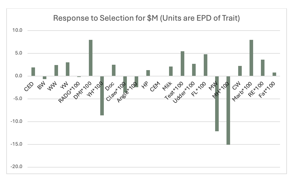 In general, selection based only on $M leads to a decreased mature cow size, while maintaining or increasing the direct weaning weight of the calves while continuing to put positive pressure on fertility and longevity.