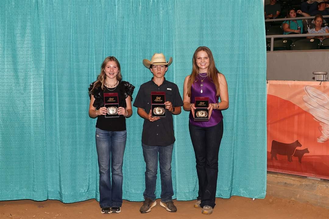 From left, Avery Mullen of Kansas, Lane Toledo of California, and Lauren Wolter of Illinois, were named winners of the Stockman Contest for their respective age divisions at the 2025 National Junior Angus Show in Tulsa, Okla.