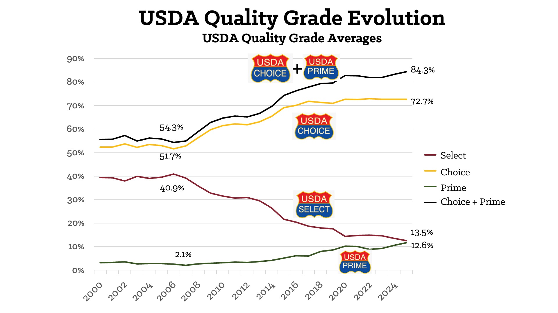 USDA Prime accounts for 12.6% of carcasses today, with combined USDA Choice and Prime reaching 84%. While higher quality cattle flood the market, the Select supply continues to drop. As Prime rates rise, so do yield grade 4s and 5s, prompting discussions on balancing quality with efficiency.